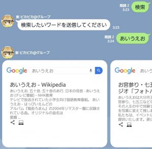 2019年12月19日 / 最終更新日時 : 2019年12月20日 ピカピカ運営者の友達 search google検索をする 「help」コマンドで表示されたコマンド一覧の 「google検索をします」を選択するか「検索」と送信した後 検索したいワードを送信することでgoogle検索ができます。 送信する ≪例≫