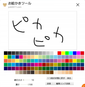 2019年12月19日 / 最終更新日時 : 2019年12月20日 ピカピカ運営者の友達 tool お絵描きツールで絵を描く help」コマンドで表示されたコマンド一覧の 「お絵描きツール」を選択すると お絵描きツールが起動します。 書いたイラストは送信することができます。 送信する ≪例≫