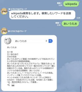 2019年12月19日 / 最終更新日時 : 2019年12月20日 ピカピカ運営者の友達 search Wikipedia検索をする 「help」コマンドで表示されたコマンド一覧の 「Wikipedia検索をします」を選択するか「Wikipedia」と送信した後 検索したいワードを送信することでWikipedia検索ができます。 送信する